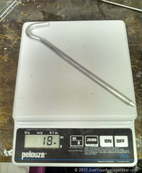 The Lawson Ti stakes are still Shepard’s Hook style – which I prefer, and make of titanium, so they are strong and light, and there are not as bulky. At 6 grams per stake, 15 stakes only comes out to about 90 grams, a savings of 180 grams! Just look at the comparison scale images below!