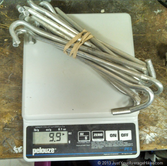 A few years back, I bought some “lightweight” aluminum stakes off of eBay (shown below). These are definitely lighter than the cheap steel ones you get out-of-the-box with this and most tents, but they are still weighty, coming in at 270 grams for 15 (18g per stake), and they are bulky… when backpacking, especially with a relatively “small” bag for one or more nights at 50 liters, space is somewhat of a premium.