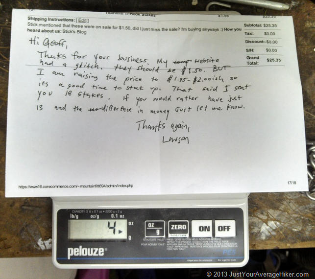 Speaking of Lawson – he is a great person to do business with. I had ordered 13 stakes, and Stick had said the price was $1.50, but the site reported $1.95. I noted this on my order, but didn’t really care, it was a difference of $5.85, and not breaking the bank – I wanted these regardless. With my order, came a note, stating that the site reported the price wrong (now fixed!), and he threw in 5 extra stakes (worth more than the $5.85), and would credit me back if I didn’t want the extras. While I have had great experiences with EMS, REI, and other outfitters, you just can’t beat the personalized and great service of a small business.